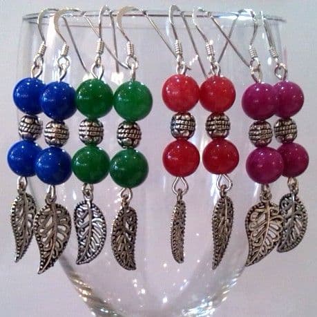 Real gemstone jade in a choice of colours! These high-quality polished 8 mm double-drops are on sturdy .925 Sterling silver hooks and feature textured Tibetan silver beads and leaf motif.