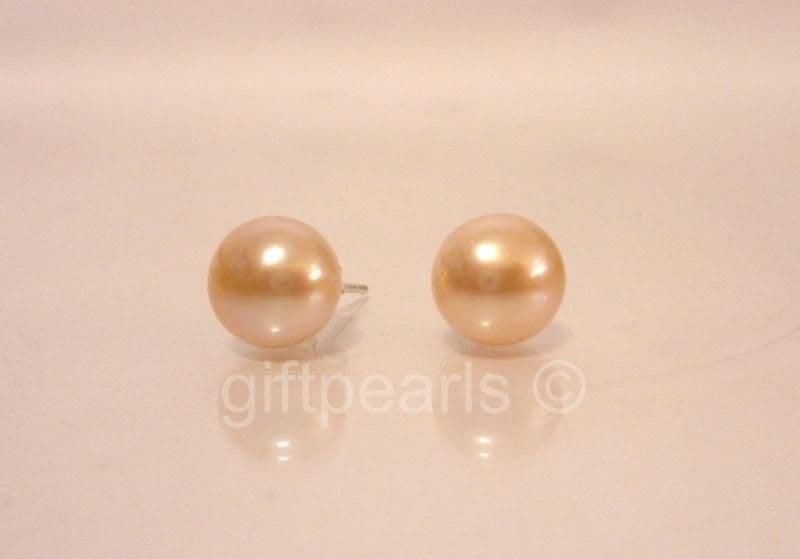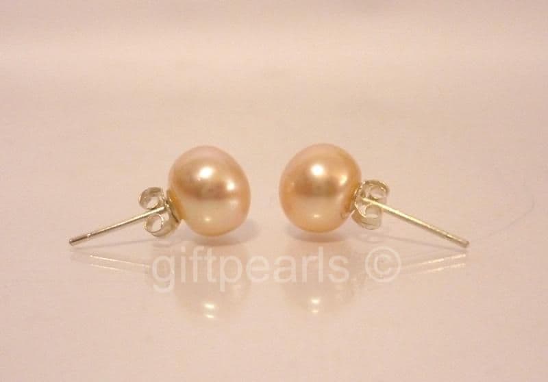 A pair of pale peach-pink medium-sized pearls on Sterling silver posts with secure butterfly backs.