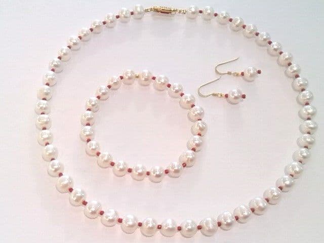 A super stylish pair of sparkling white mid-size (8 mm) white pearls and blood red coral contrast beads. The Sterling silver hooks have a heavy plating of real gold. This eye-catching pair of drop ear-rings is offered at only £20.00 including your choice of pretty and practical purse or a handsome gift box.