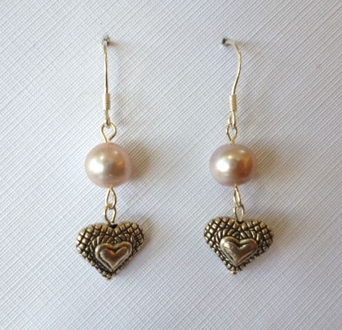 A pair of beautiful 8 mm round pearl ear-rings with cute and stylish Tibetan silver heart pendants.