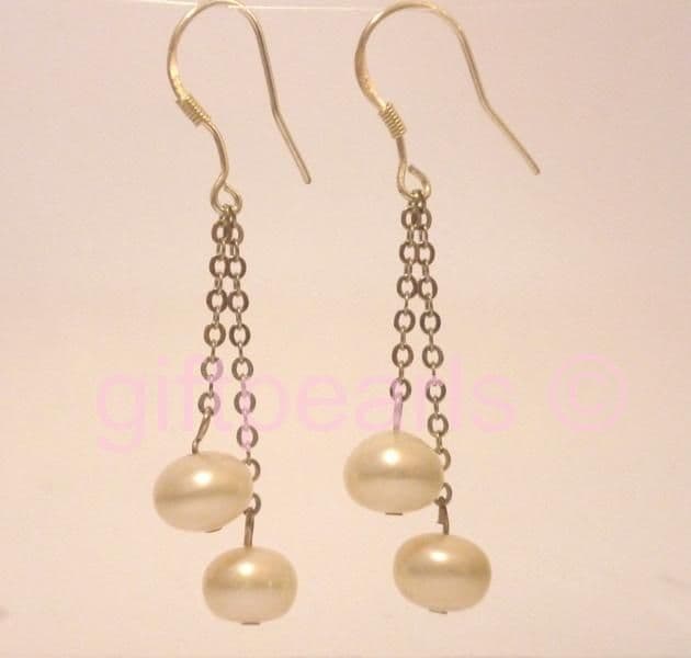 An eye-catching pair of ear-rings. Twin 7-8mm white pearls on a dangly silver chain and Sterling silver hooks.