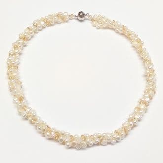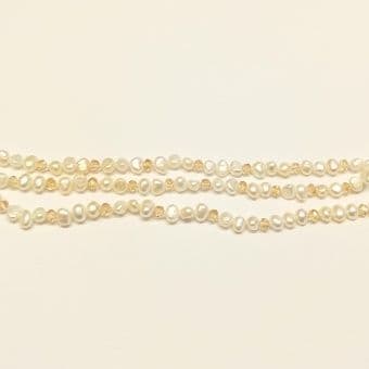 A delightfully chic and versatile necklace style. The small highly lustrous *baroque pearls are highlighted by the sparkling, diamond-cut champagne crystals. The necklace comes as 3 rows of standard 18 inch length, which can be worn twisted into a rope or open, as separate strands.